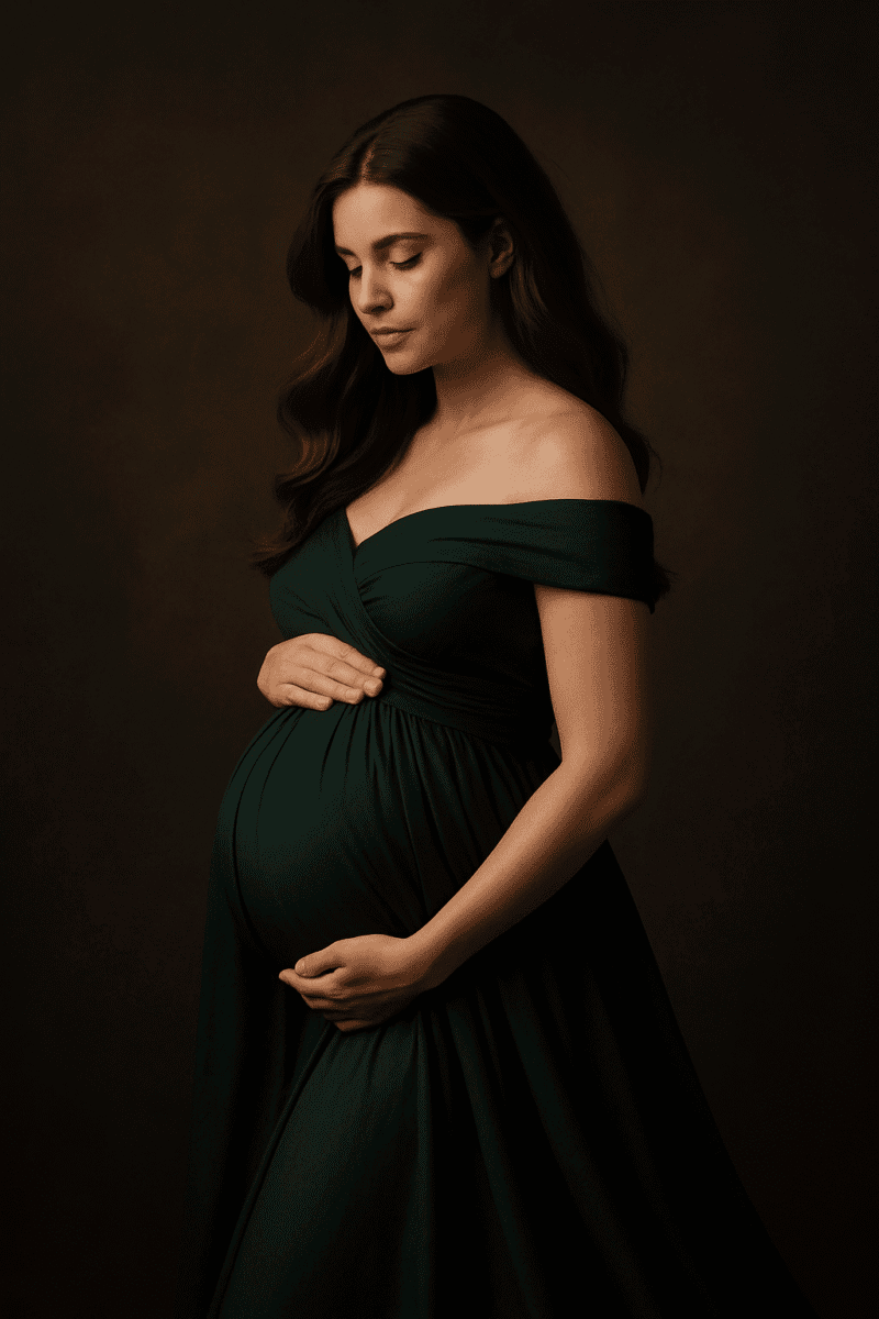 Fine art maternity portraits are NOT your everyday snapshots. They’re carefully planned, beautifully lit, and styled to feel like works of art. Think of dreamy dresses, gorgeous backdrops, professional posing, and lighting that makes you glow like a goddess.